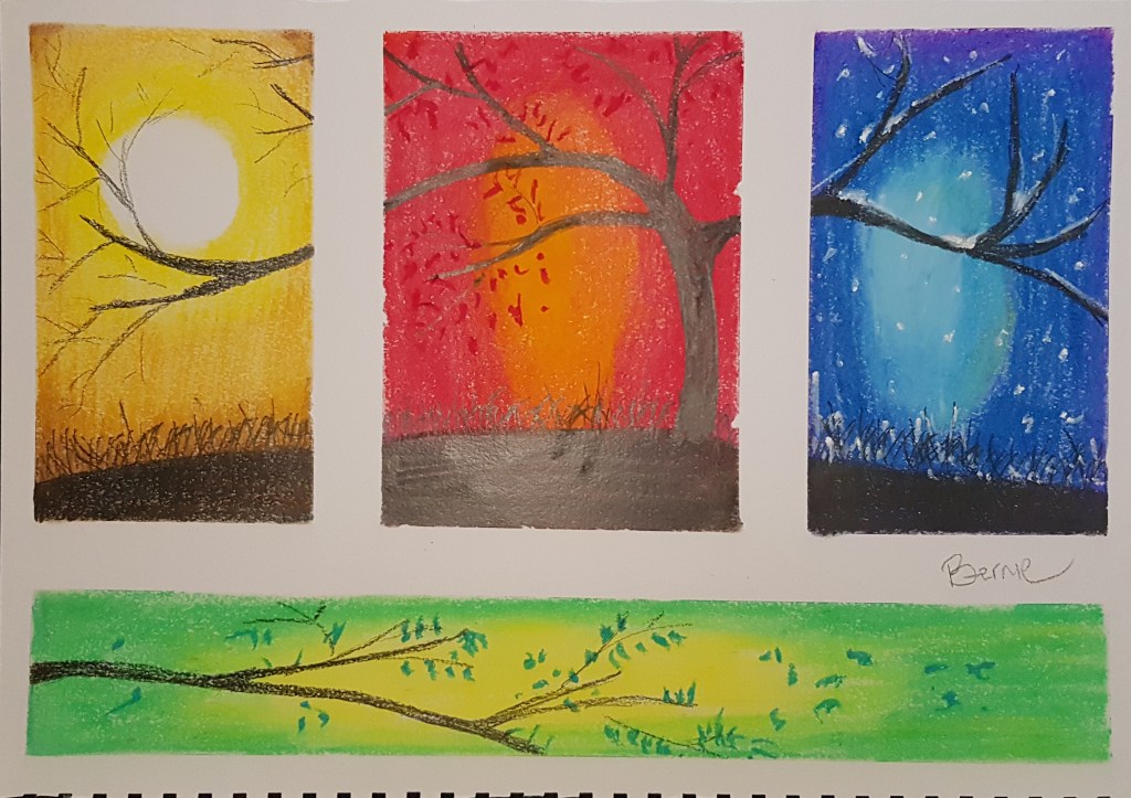 Four Seasons Original in Oil Pastels and Pencil Size: 20 x 30 cm (unframed) Share this: Click to share on Facebook (Opens in new window) Facebook Click to share on X (Opens in new window) X Click to share on LinkedIn (Opens in new window) LinkedIn Like Loading...